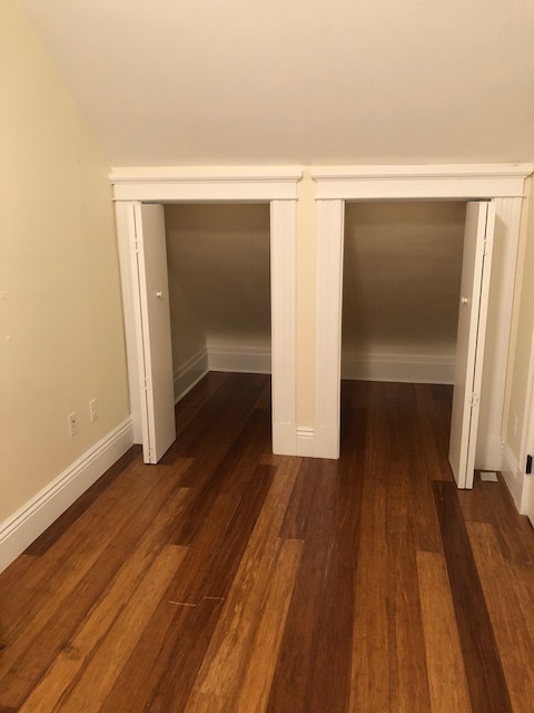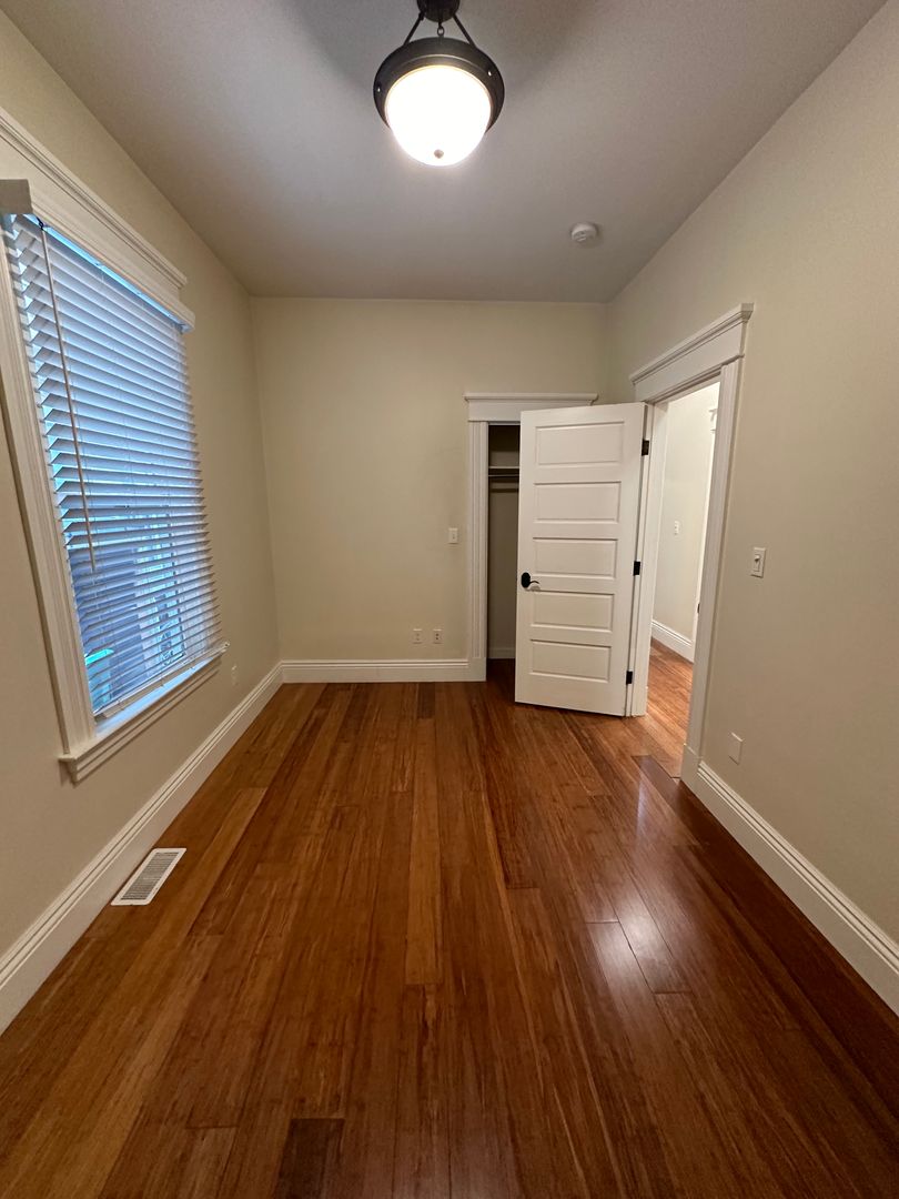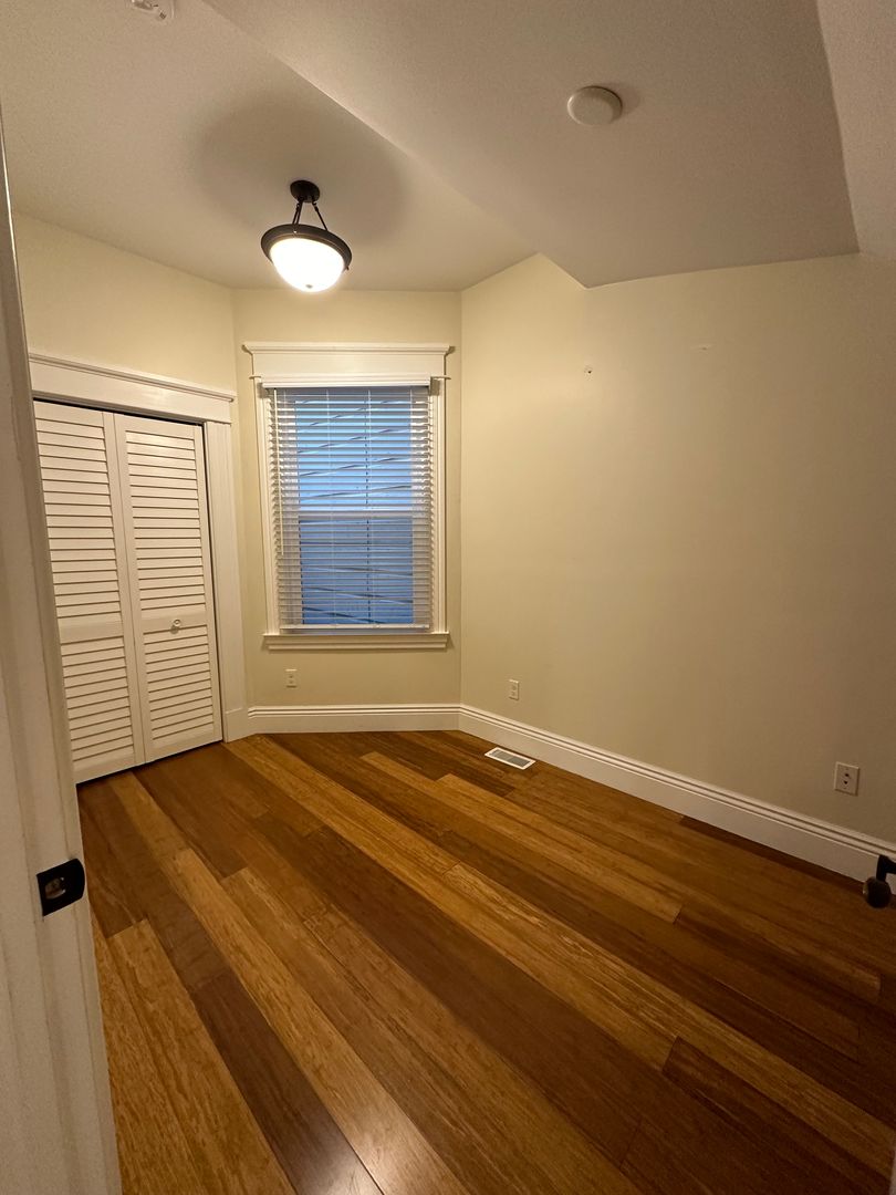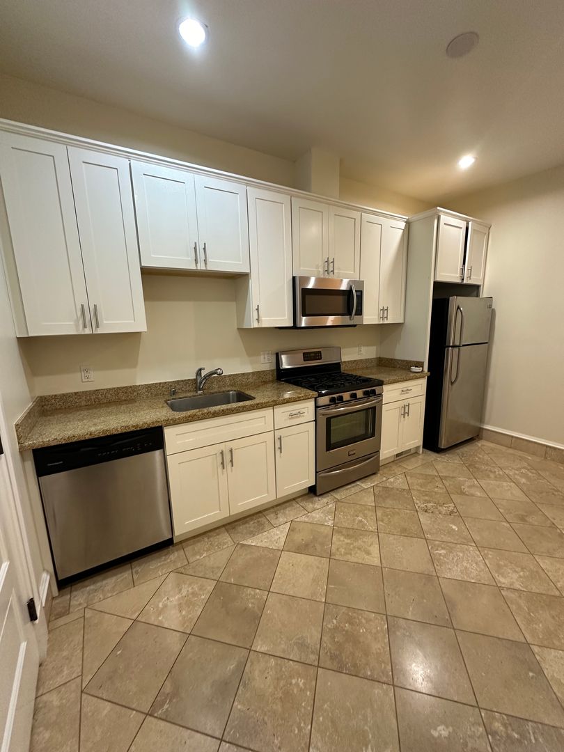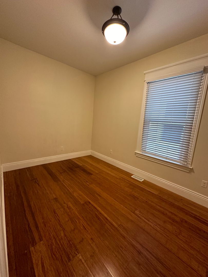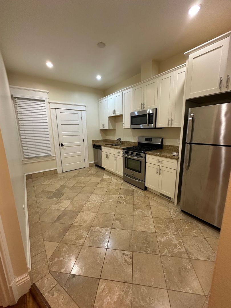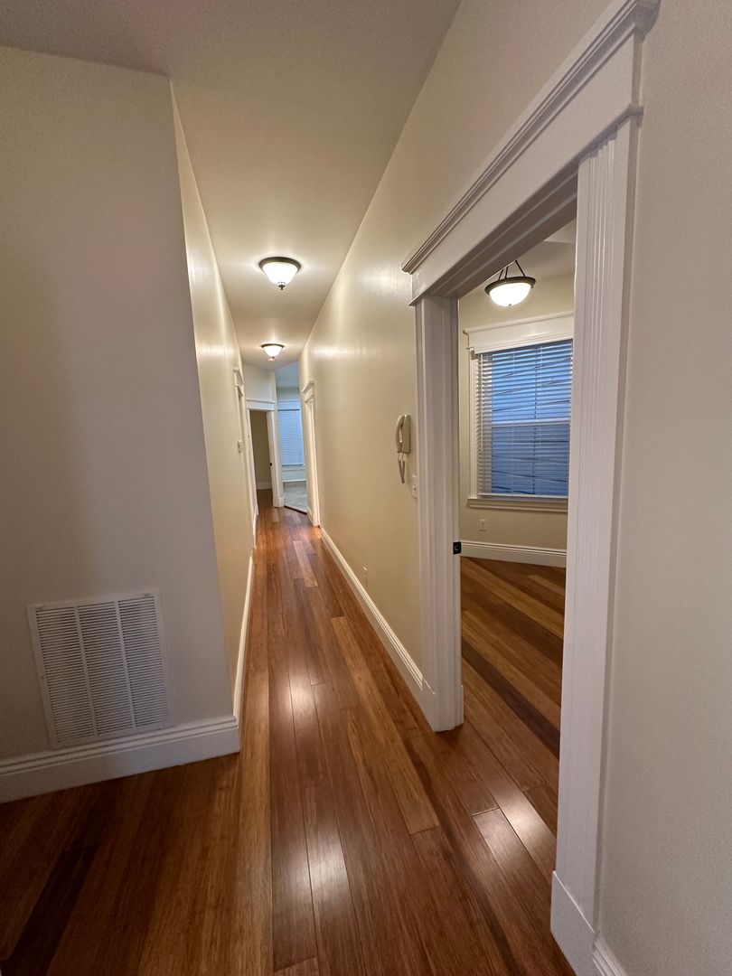 Three-bedroom, one-bath unit and a spacious living room that may be used as an additional bedroom. Set back from the street, the property offers added privacy with a gated entrance. The interior features hardwood floors throughout and a modern kitchen equipped with stainless steel appliances, including a dishwasher, built-in microwave, and garbage disposal.